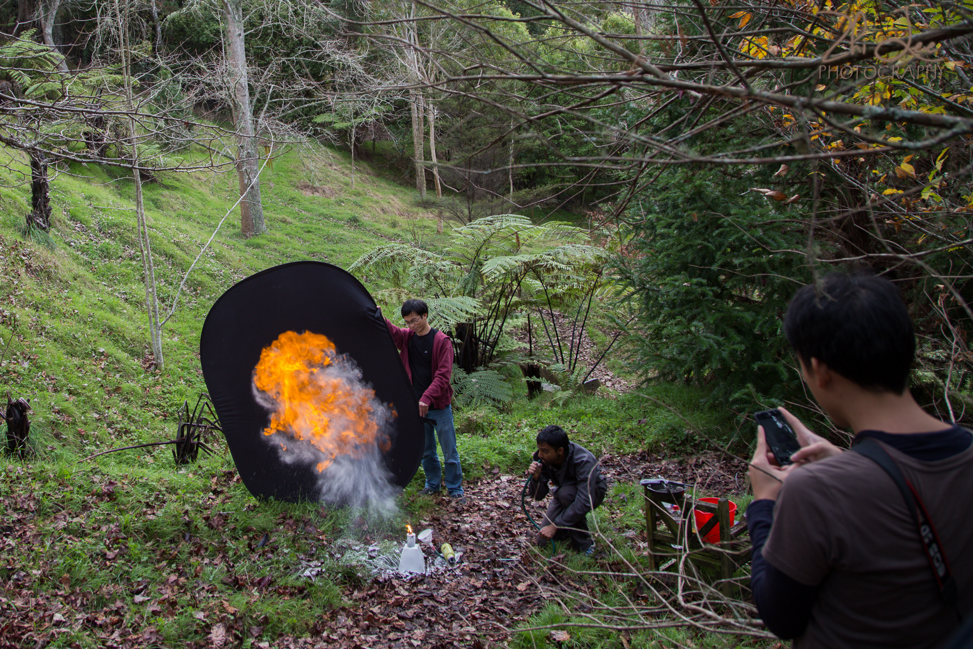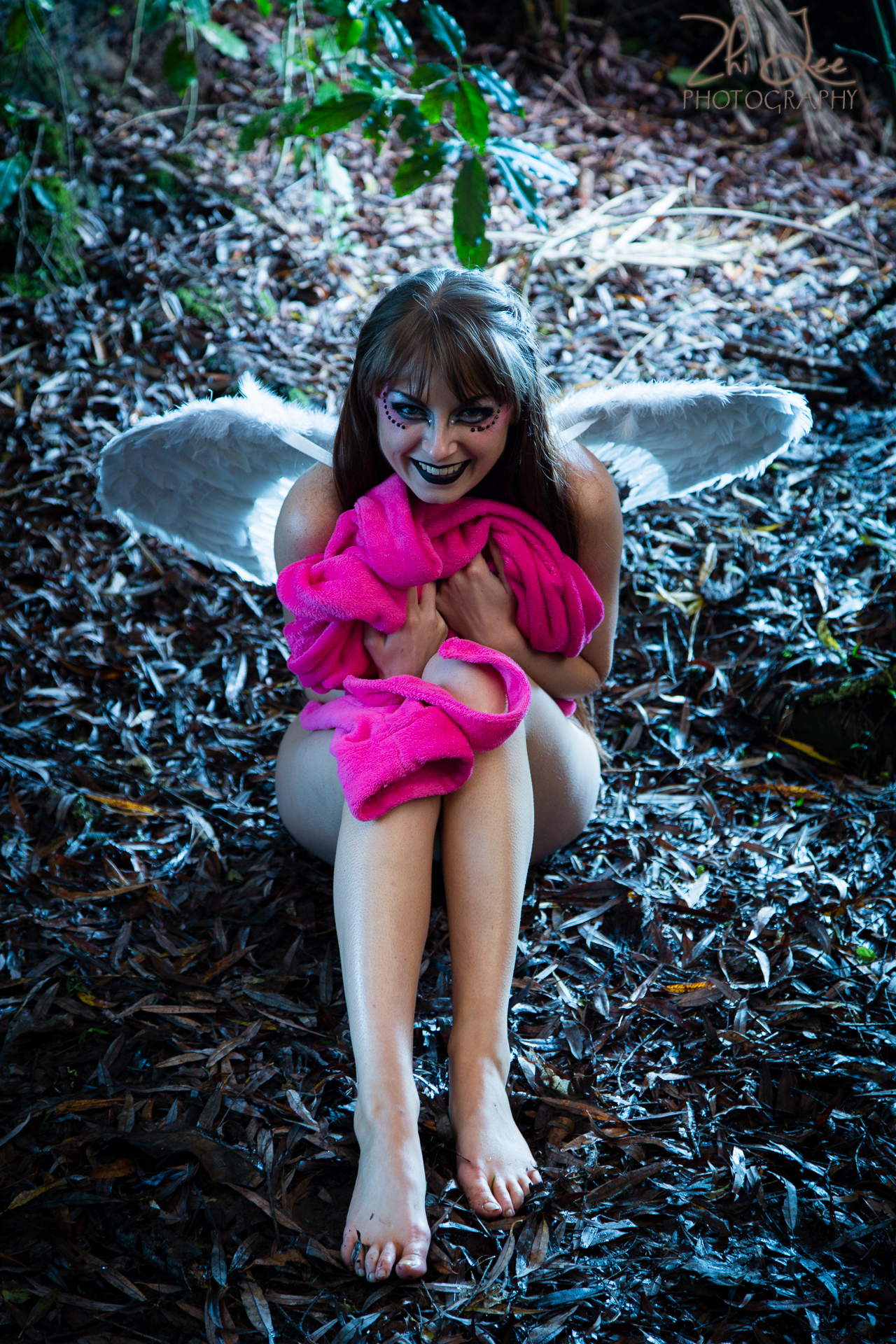 After our main dark angel shoot, we took to a darker more shaded part of the forest and did some magic with just 1 large 80cm x 120cm softbox. To get a nice reflection on the angel wings, we bright the softbox right in close. A few branches and twigs were cloned out to declutter the image but as much was left in as needed to set the forest scene.